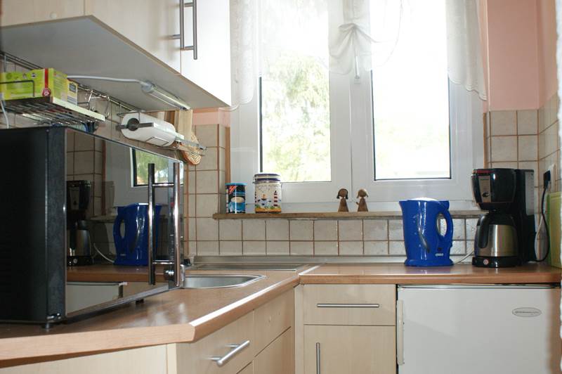 Mikrowelle/Backofen, Kaffeemaschine, Kühlschrank, Herd, Toaster, Geschirr, Kochtöpfe, Besteck