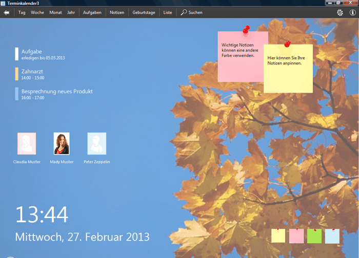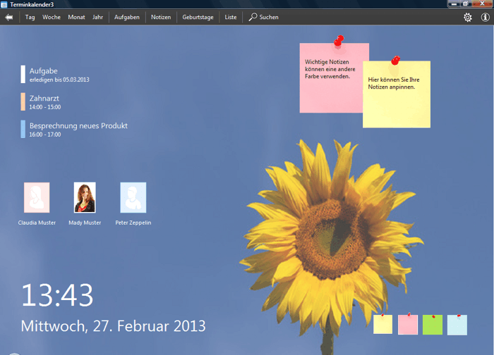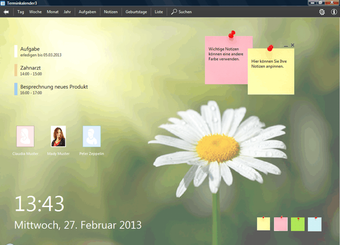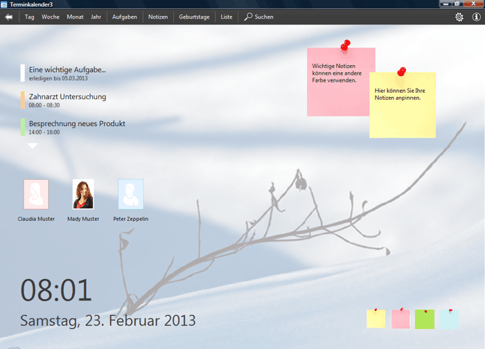 Im Home-Bildschirm werden Ihnen übersichtlich die Termine und Aufgaben des aktuellen Tages und die Geburtstage der kommenden Tage angezeigt. Sie können auch farbige Notizzettel mit Ihren Notizen direkt an den Home-Bildschirm 'pinnen'.