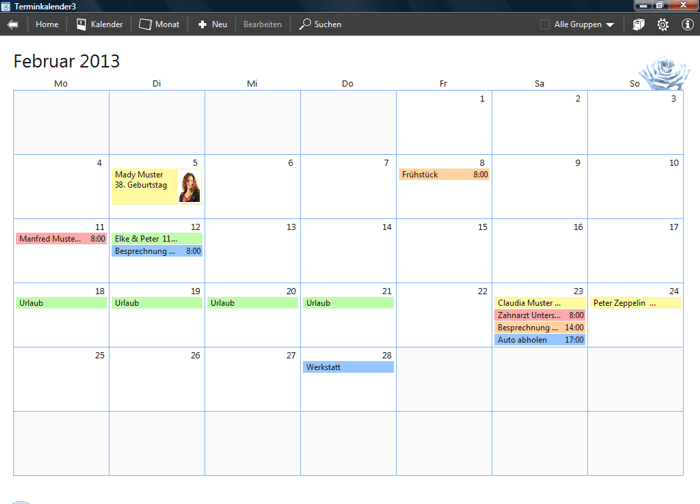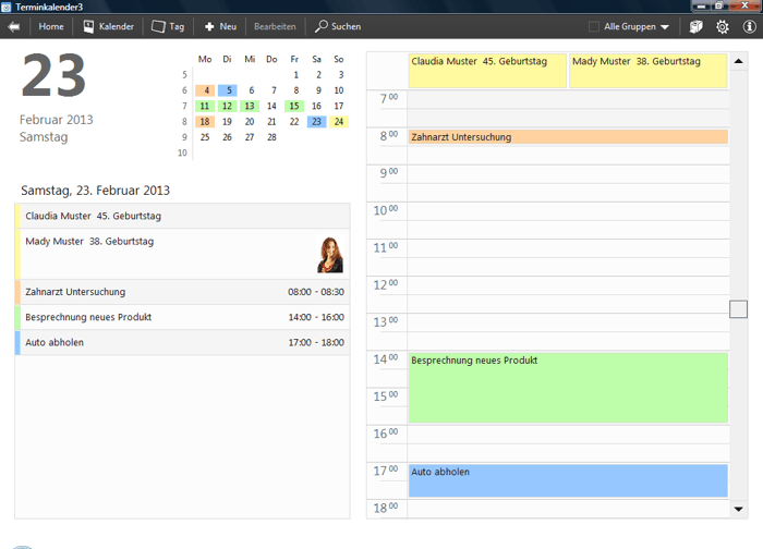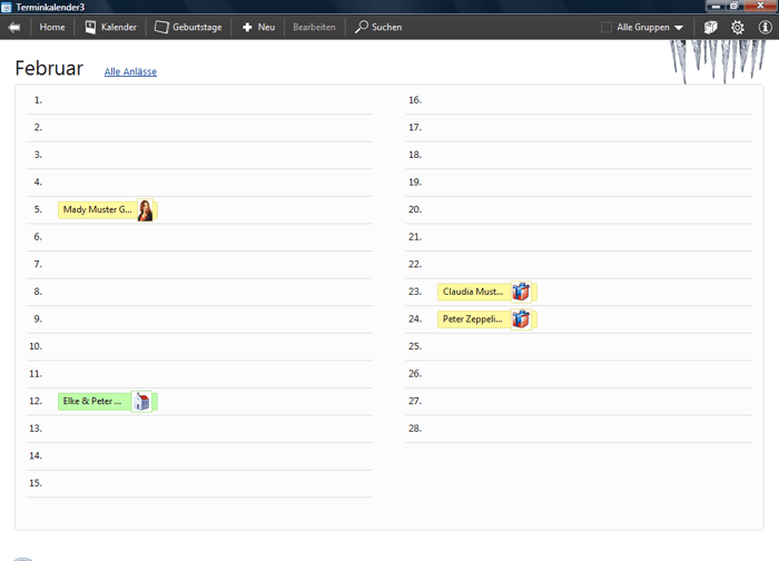 Über den integrierten Geburtstagskalender können Sie alle Geburtstage Ihrer Freunde, Bekannten oder Geschäftskollegen erfassen. Die Geburtstage werden automatisch im Terminkalender angezeigt, auf Wunsch erinnert Sie der Terminkalender rechtzeitig daran ein Geschenk zu kaufen.