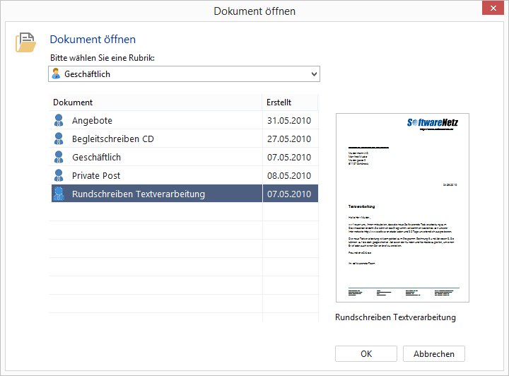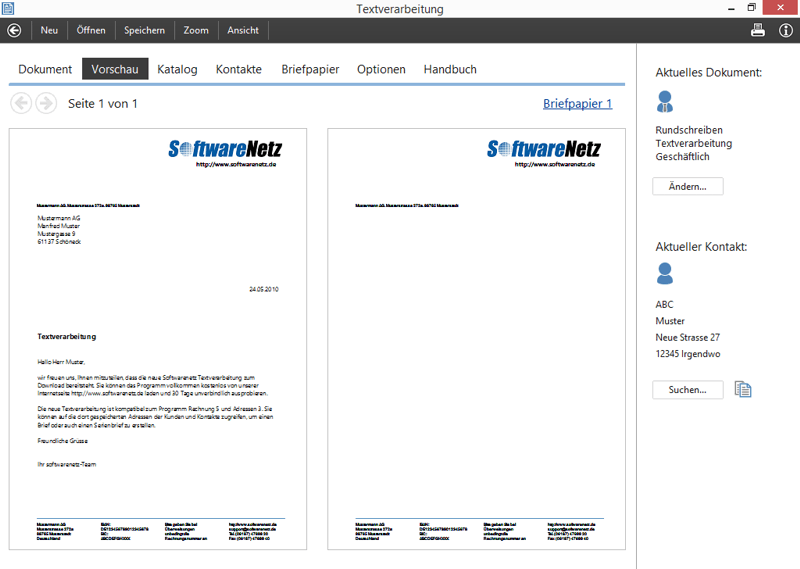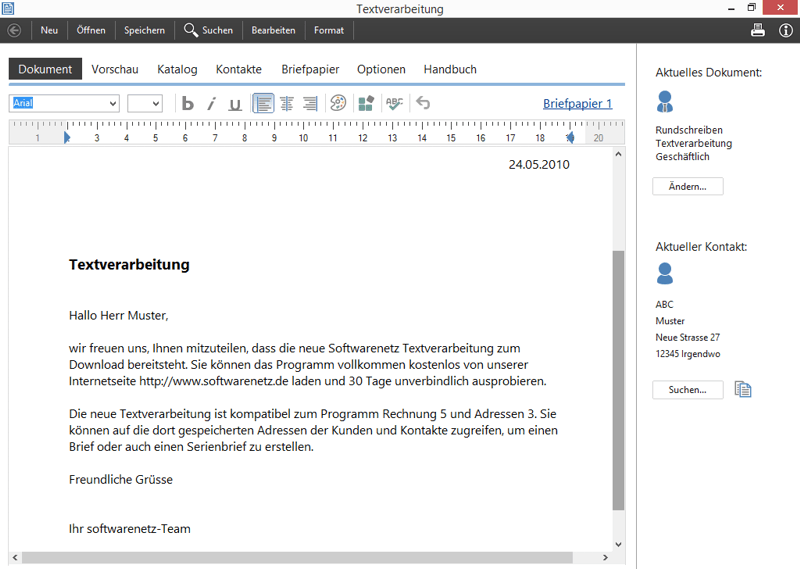 Die Textverarbeitung von softwarenetz ist ein einfaches anwenderfreundliches Programm für Ihre privaten und geschäftlichen Briefe. Alle erstellten Dokumente können Sie nicht nur drucken, sondern auch direkt als Pdf-Dokument speichern oder per E-Mail versenden.