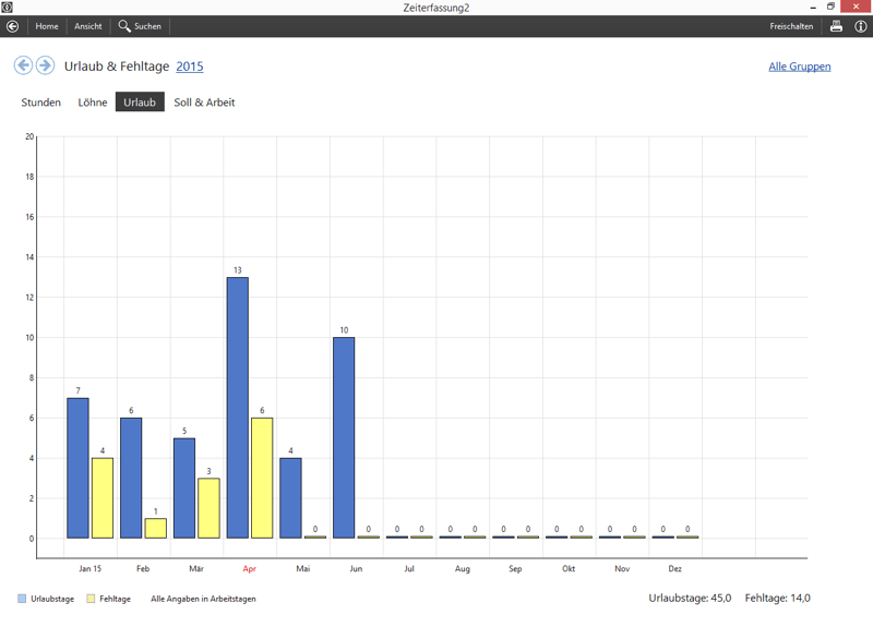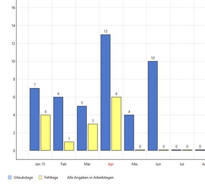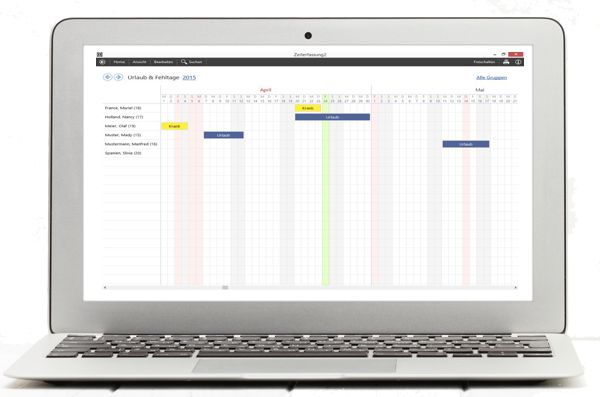 Im übersichtlichen Urlaubsplaner können Sie den Urlaub Ihrer Mitarbeiter eintragen. Das Zeiterfassungs-Programm berechnet automatisch die Urlaubstage und zeigt den Jahresresturlaub an. Sie können für jeden Mitarbeiter die Anzahl der Jahresurlaubstage seperat für jedes Jahr festlegen.